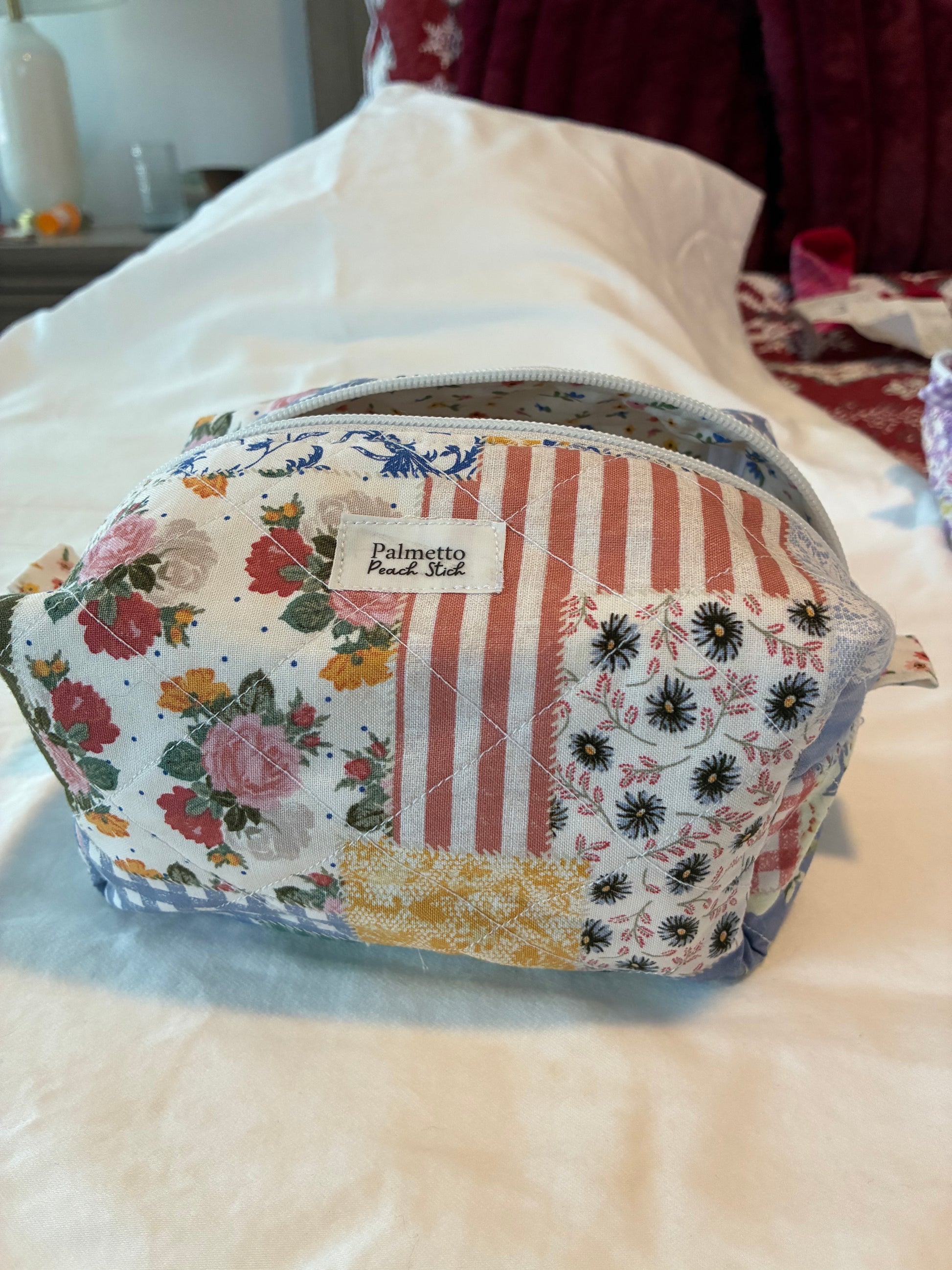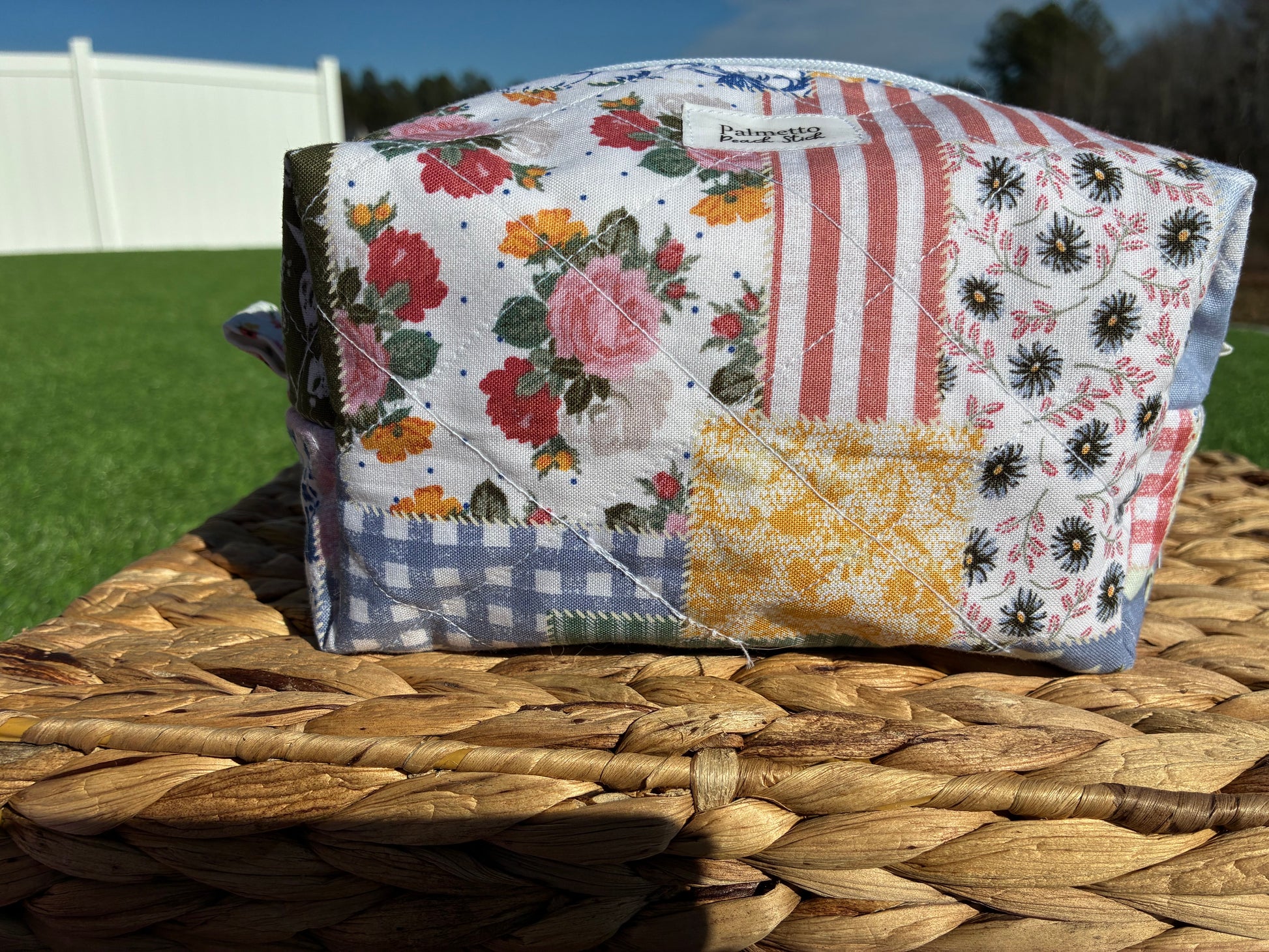 Quilted Picnic patch work with traditional colors, 8"in W x 4"in H, 4"in deep. Lining is mini floral on the inside. Exterior has 2 Pull tabs.
