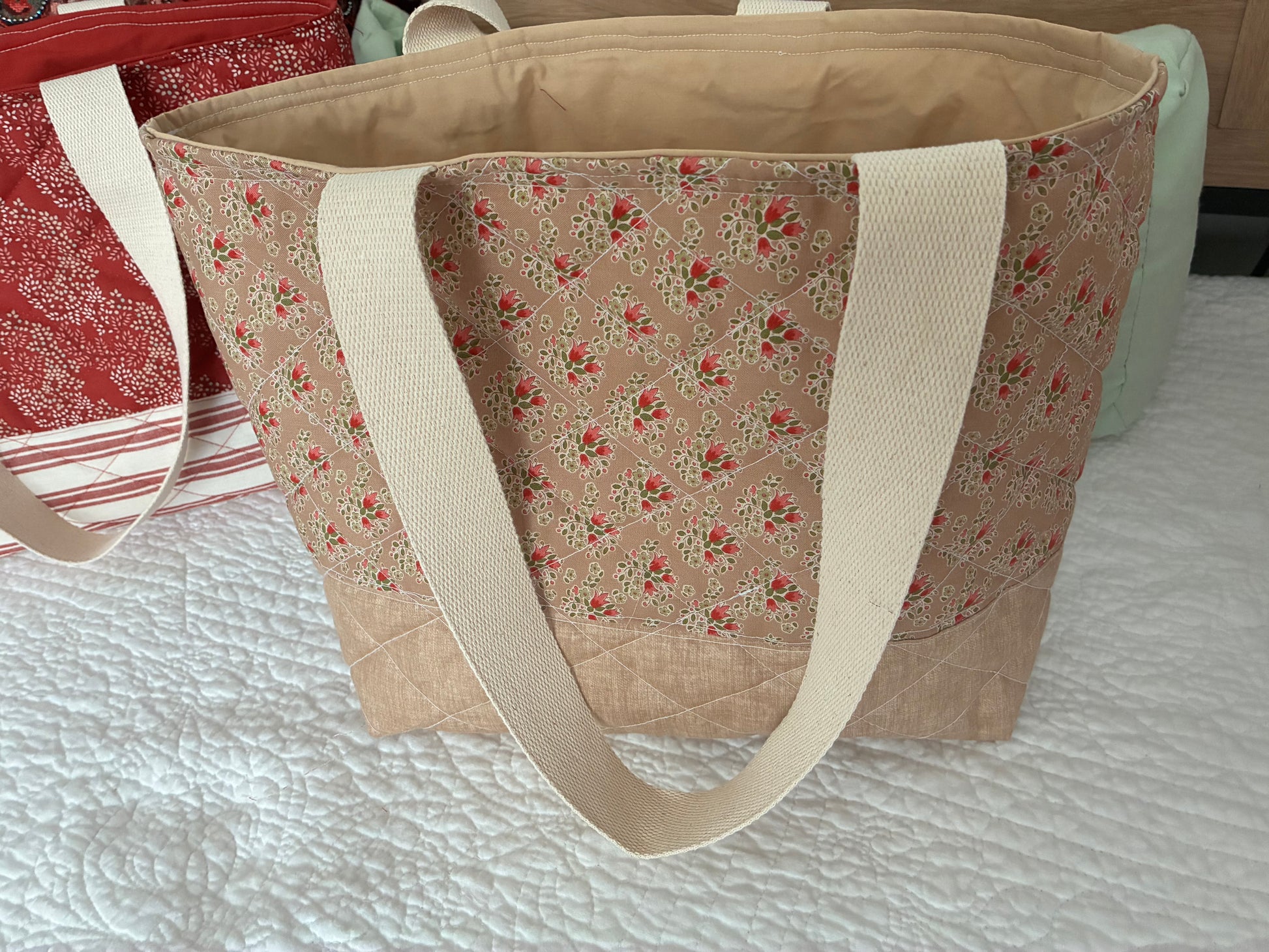 Quilted tote measures 17"W x 11 1/2" H 6" inches deep, 2 side by side pockets 6 inches and 2- 2inch pockets on each side, pockets are great to put in cell phone, pens, post it notes or carry your smaller personal items. Shoulder straps made of webbing material.